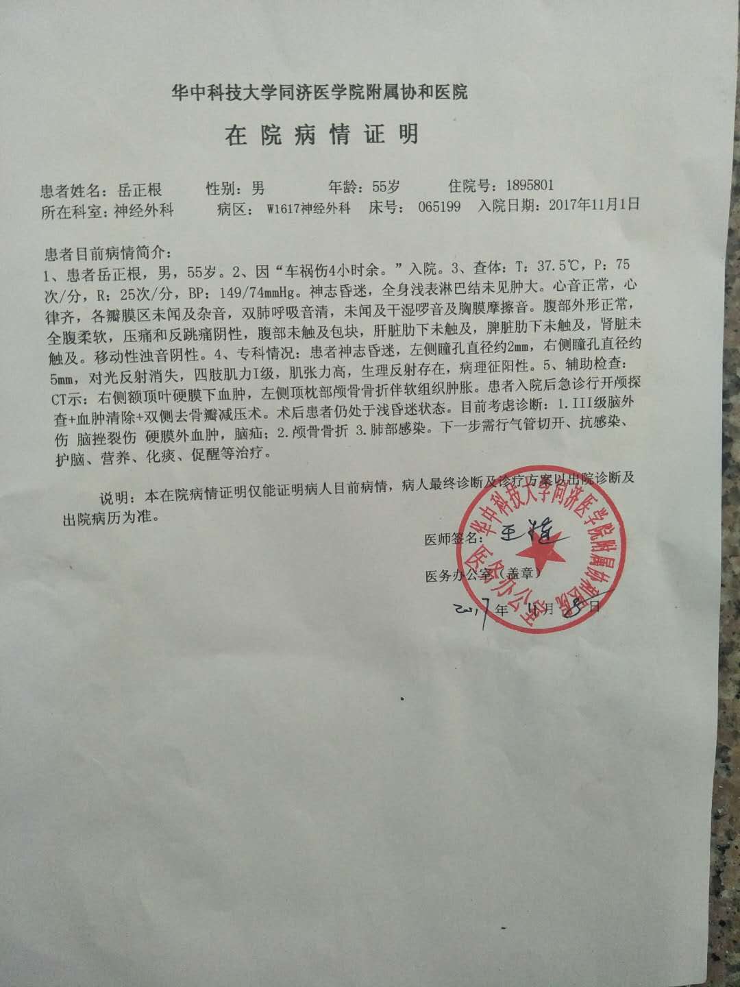 心博注册服务部服务人员岳亮他57岁的老父亲在骑摩托车在312国道寨河转盘左地被对向一辆轿车撞飞。头部着地导致颅内血及腰部骨折,于当晚转院至武汉市协和医院抢救,进行两次开颅手术,目前仍在重症监护室观察。