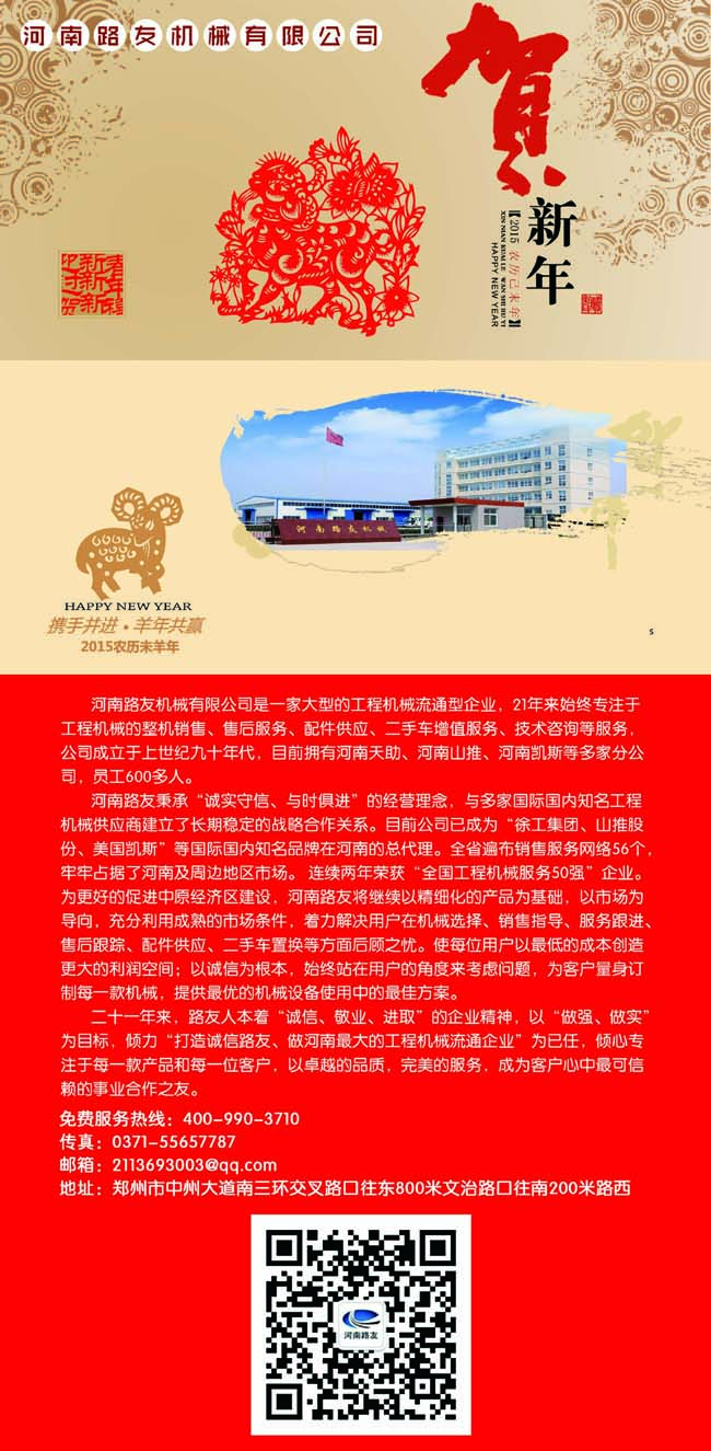 2015河南路友机械已做好全面的准备,我们将以全新的姿态,为您奉上更为贴心的服务。羊年将至,河南路友机械全体员工,恭祝您在新的一年大展宏图、阖家幸福、身体健康、平安如意!