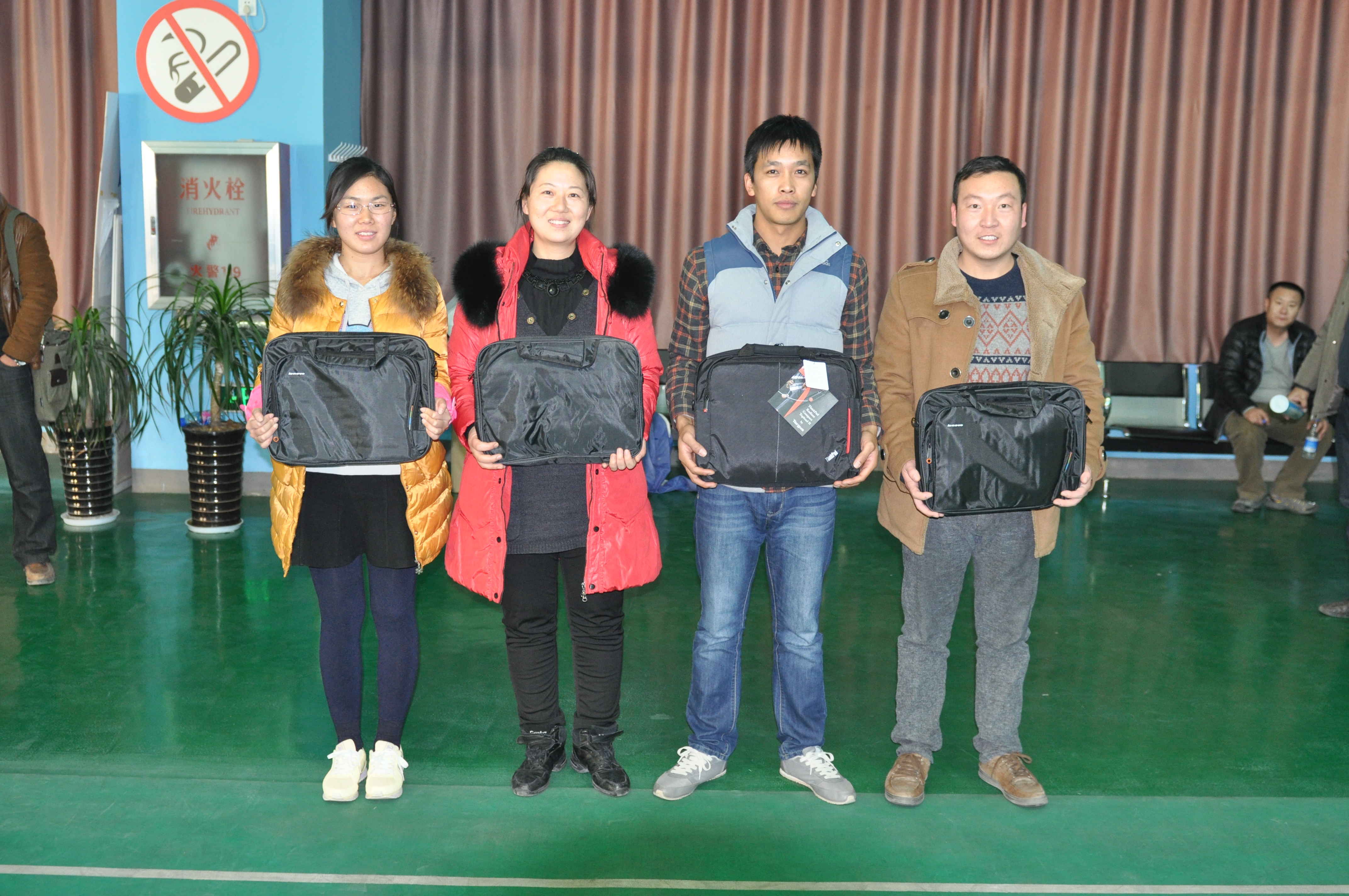 参赛过程中,大家你追我赶,每个人都不甘示弱,都在为赢得荣誉而战,为欢乐而战,上图为我们的季军得主,分别由河南路友机械心博注册起重机部门贾静、心博注册配件部徐晓鹏等4个摘得,奖品为精品电脑包一个。让我们祝贺大家吧!