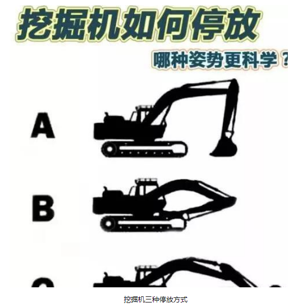 C:这种停放方式油缸全部处于收缩状态,有利于保护油缸,也方便第二天工作前检查液压油。如果是雨雪天气或者工地附近有放炮等施工作业,建议大家这样停机,可以更好的保护挖机的油缸。如果赶上停工放假或者挖机长时间不干活的时候,这样停可以让油缸全部泡在液压油里面,大大的保护了油缸的寿命。