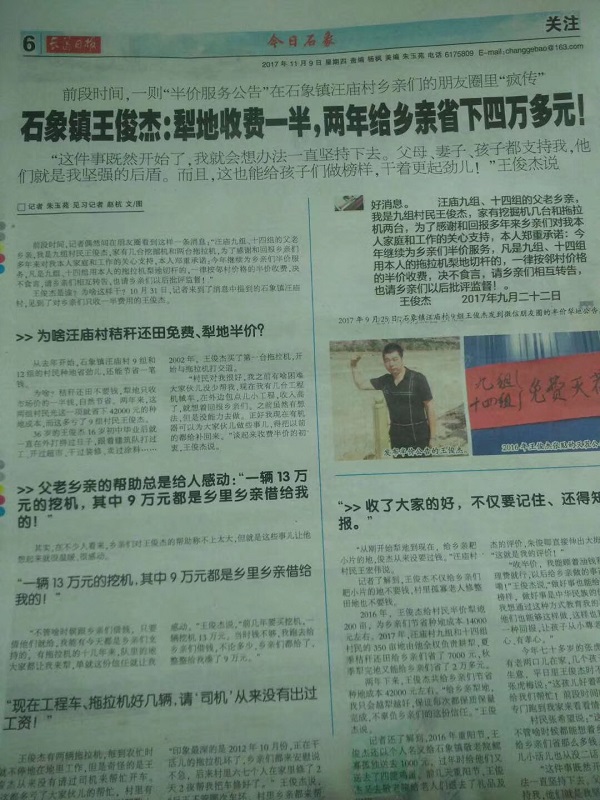 2016年,王俊杰给村里村民半价犁地200亩,为乡亲们节省种地成本14000元左右。2017年,汪庙村九组和十四组村民的350亩地由他全权负责耕犁,夏季秸秆还田给乡亲们省了7000元,秋季犁完地又能给乡亲们省了2万多元。
