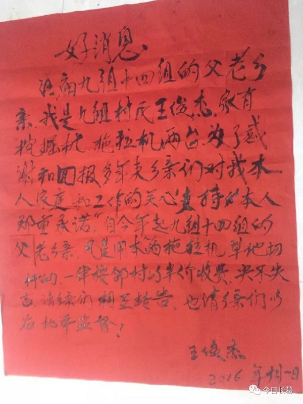 先用一张红纸来开启我们今天的故事,短短的十行字,包含着对乡亲们的深情厚意,一个会感恩、能报答、知思源的小伙子,立誓要为家乡的父老乡亲办实事、办好事。而且这一个举动,就为乡亲们节省4.2万元!