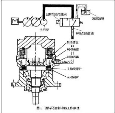1 台心博注册挖掘机出现偶尔无法回转故障,我们按照以下步骤进行排查:首先,检查回转制动电磁阀导线和接地正常;其次,清洗回转制动电磁阀阀芯;然后,拆开从回转制动电磁阀到回转马达用于解除回转制动的管路,启动发动机操纵挖掘机回转,发现从该油管中喷出大量橡胶异物,由此断定是解除回转制动器的液压管路堵塞;最后,清洗该管路后试机,该挖掘机回转正常,回转马达制动器工作原理如图 2 所示。