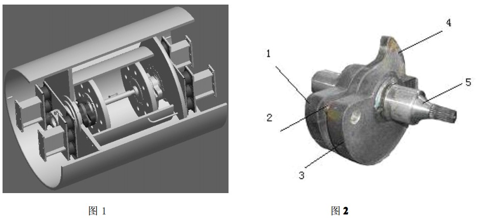 振动轮的外形和内部结构如图所示:偏心块 4 焊接在轴上,通过调心轴承 3 支承在轴承罩 2 上,轴承罩通过螺栓紧固在钢轮 1 上,两组偏心机构由中间轴花健连接。动力由马达从一端输入,马达固定在马达托架上,马达托架和框架固定在一起,一起连接在前机架上。偏心结构如图 2 所示,偏心机构由五部分组成: